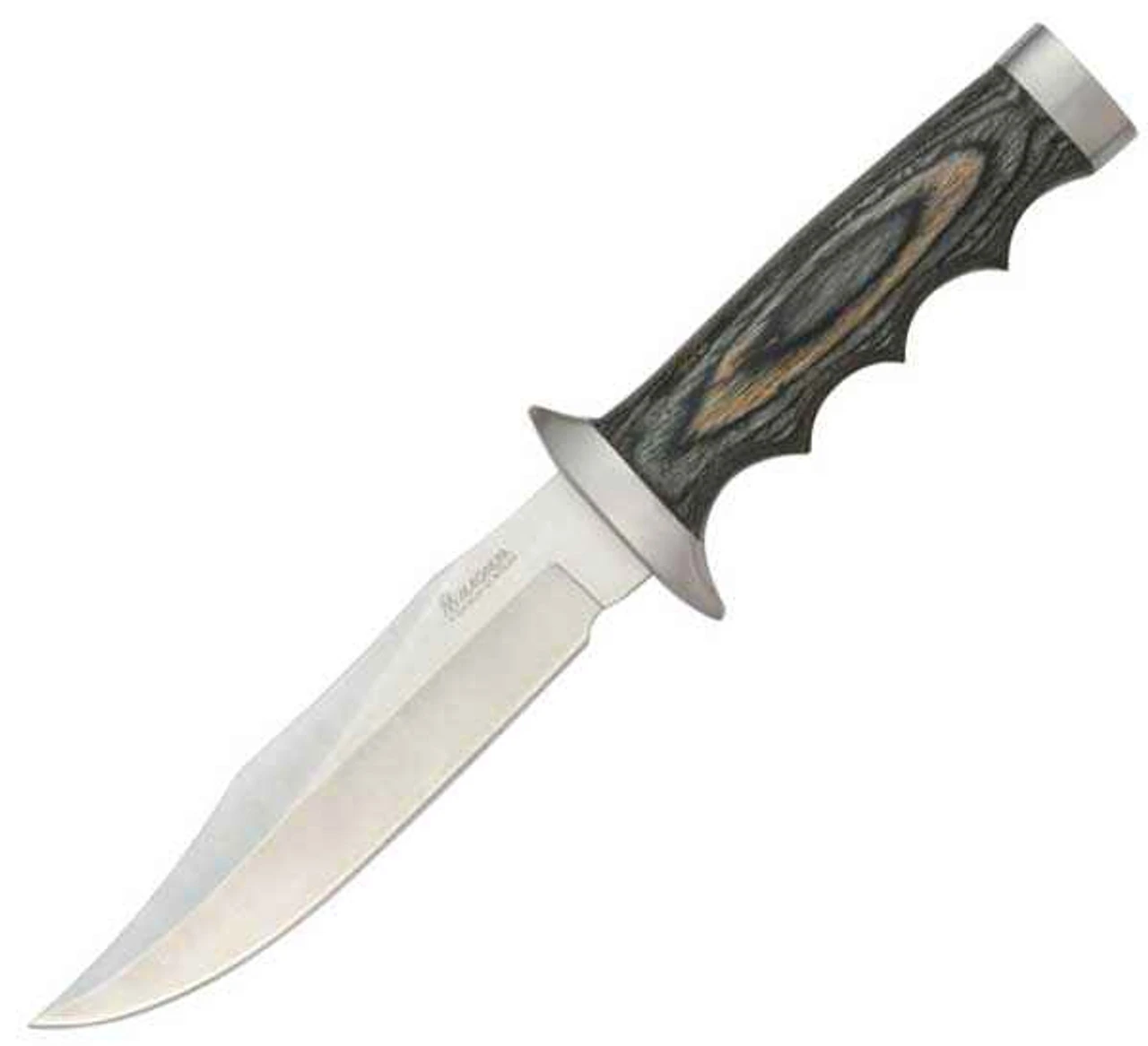 A powerful fixed blade knife with a 6″ long bowie style blade made of 440 stainless steel. The grooved handle features attractive laminated wood, and the guard and pommel are made of satin finished stainless steel. Includes brown leather sheath with front pocket and sharpening stone.
