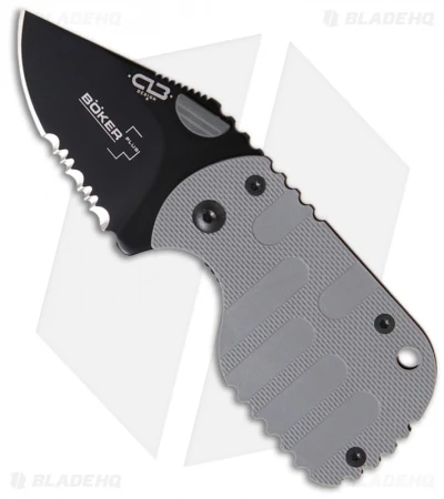 The Chad Los Banos designed Subcom F knife from Boker Plus is small in size, but don’t underestimate the functionality or power of this compact knife! The black finished AUS-8 stainless steel blade is partially serrated with ambidextrous thumb studs. The handle is gray fiberglass reinforced nylon (FRN) with a framelock back. The tip-up/down carry pocket clip can also be used as a money clip.